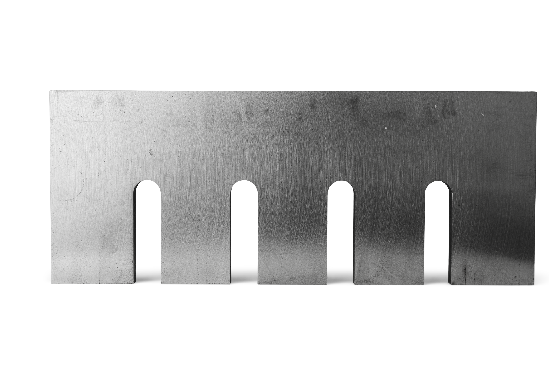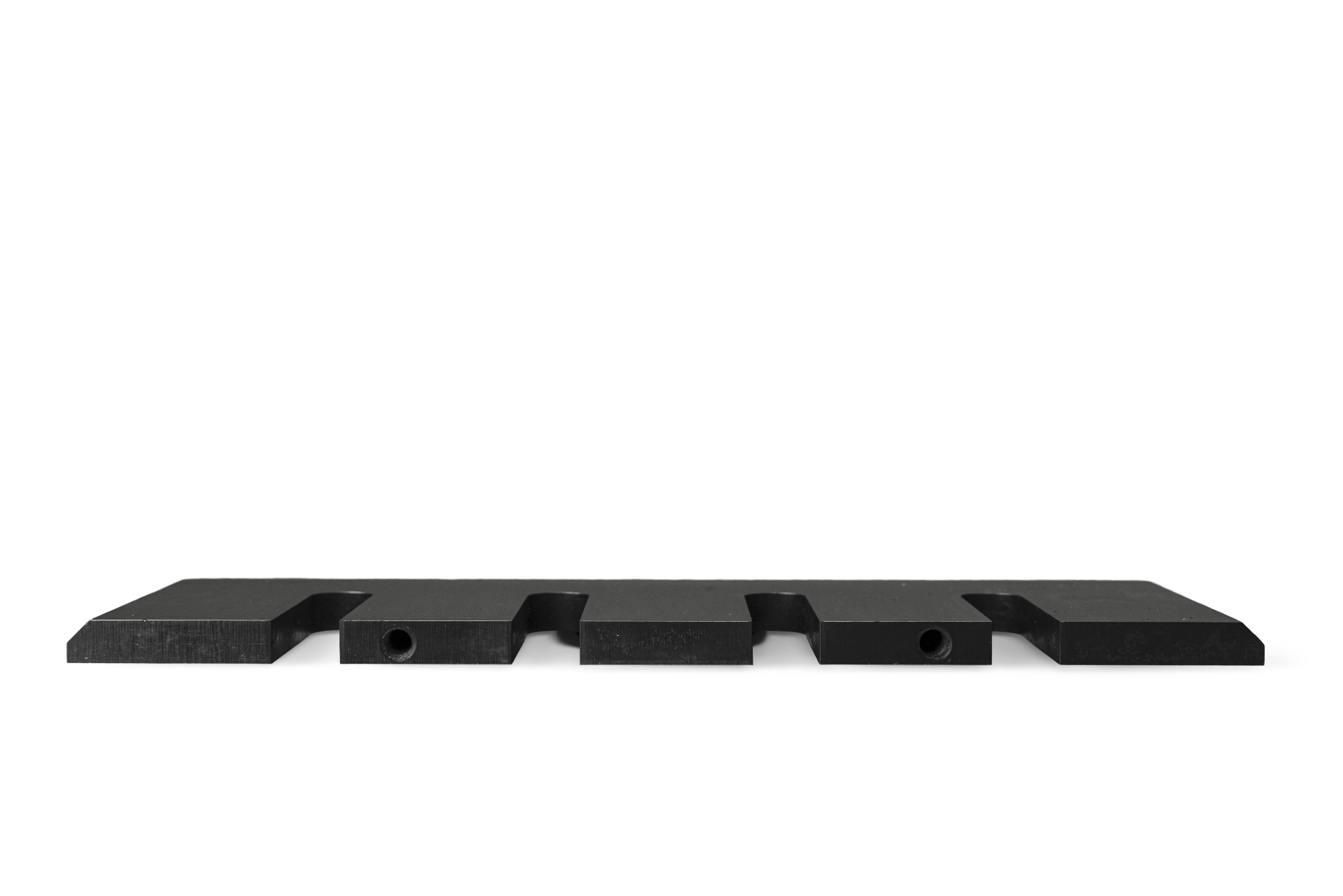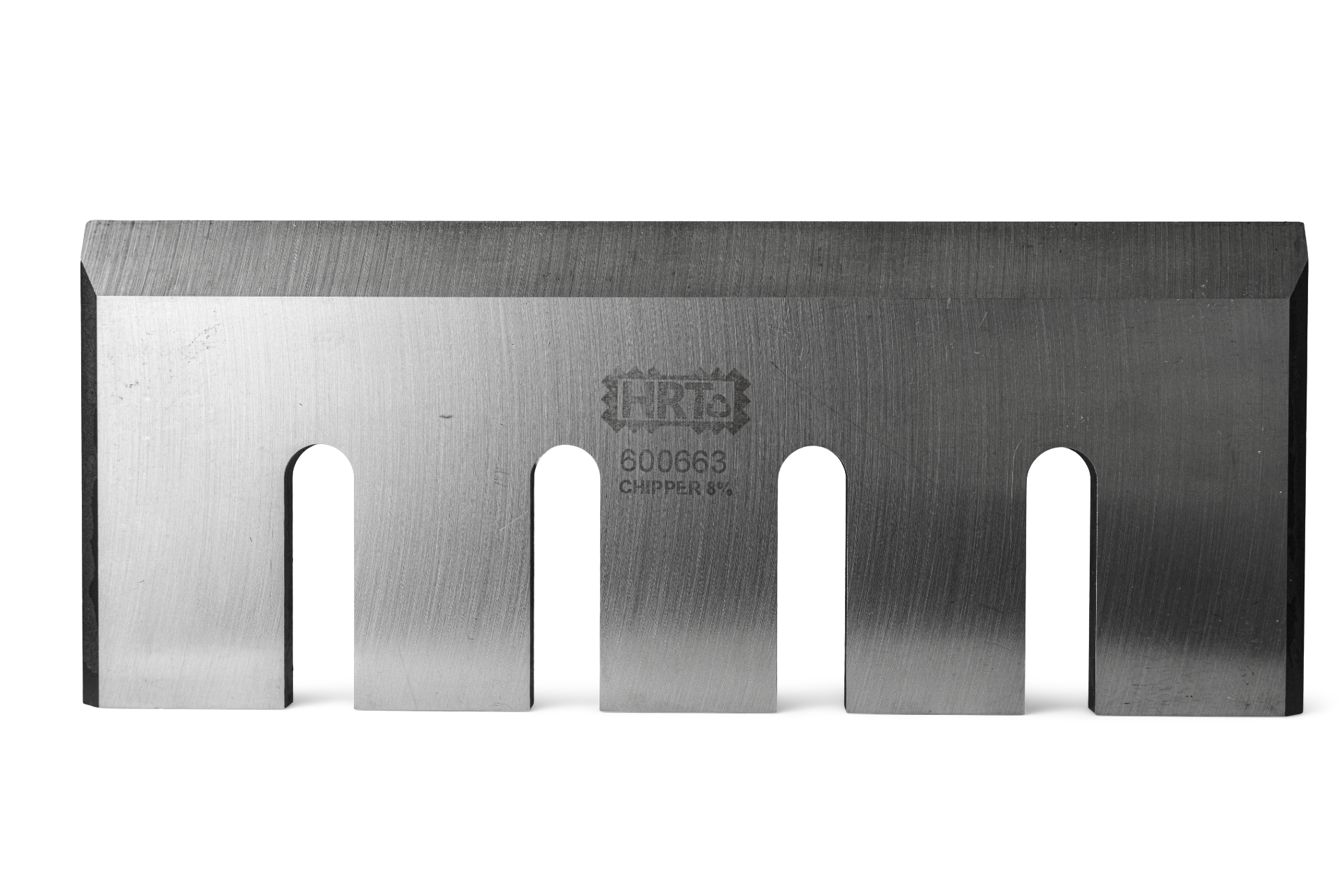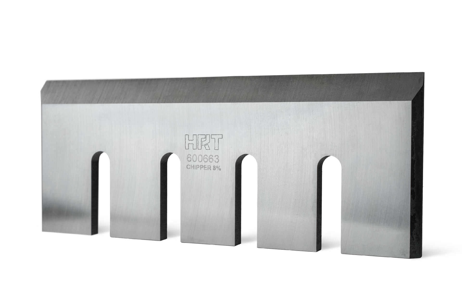 HRT® chipper knife fitting Greentec chippers made from premium chipper steel with chromium carbides. Knife with two fine threaded M8 holes. Knife with four slots. Length: 325mm Width: 130mm Height: 12mm